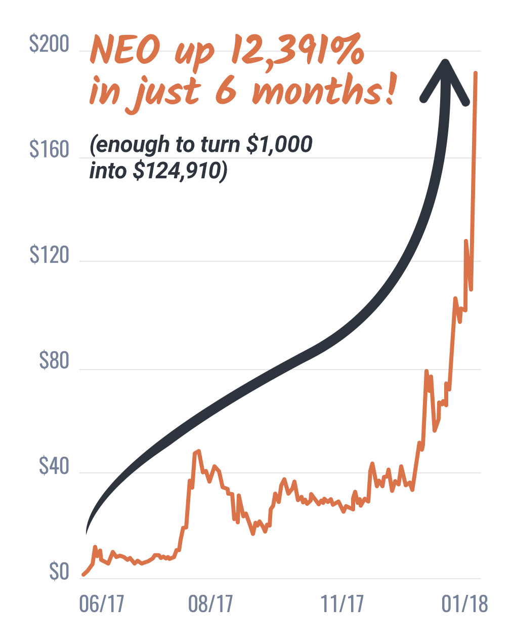 In October of 2017, its price was only $0.53, and just three months later, it sold for $18.25. That’s a gain of 3,343%.