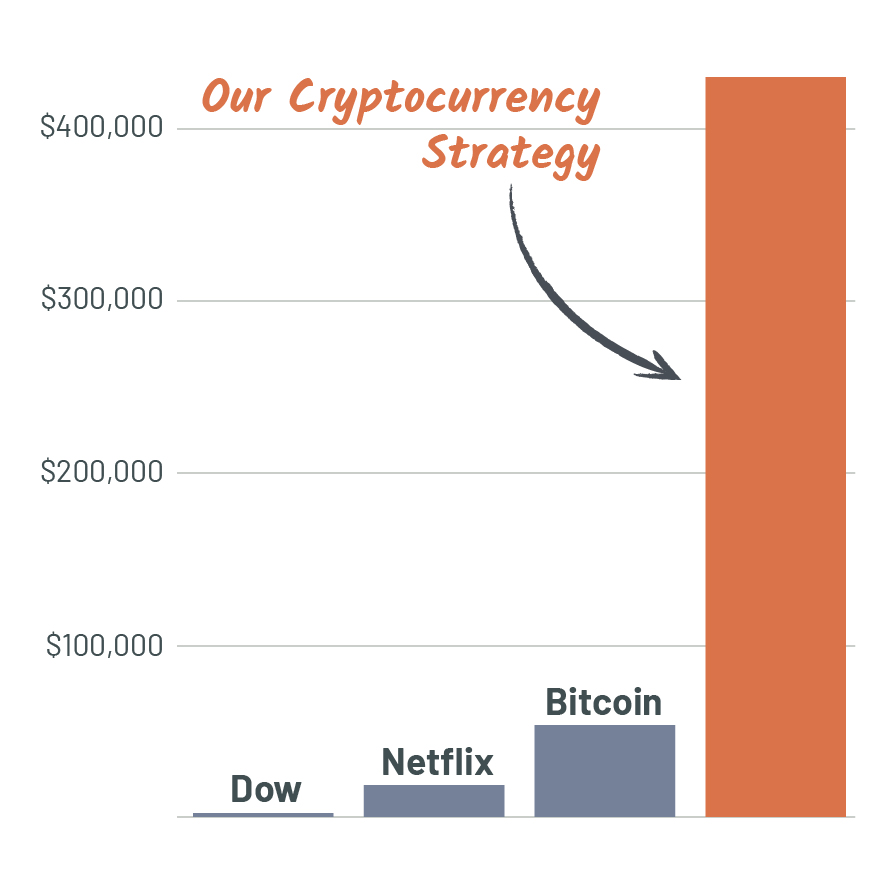 - Rapid growth! We backtested this strategy in many ways, and almost every test significantly outperformed Bitcoin. If you had followed one of the less profitable approaches, you could have turned $10,000 into $439,367 from early 2017 through September 2018, despite declines that took place in 2018. That’s 7.6 times better than Bitcoin, 22 times better than Netflix and 129 better than the Dow in the same period.*